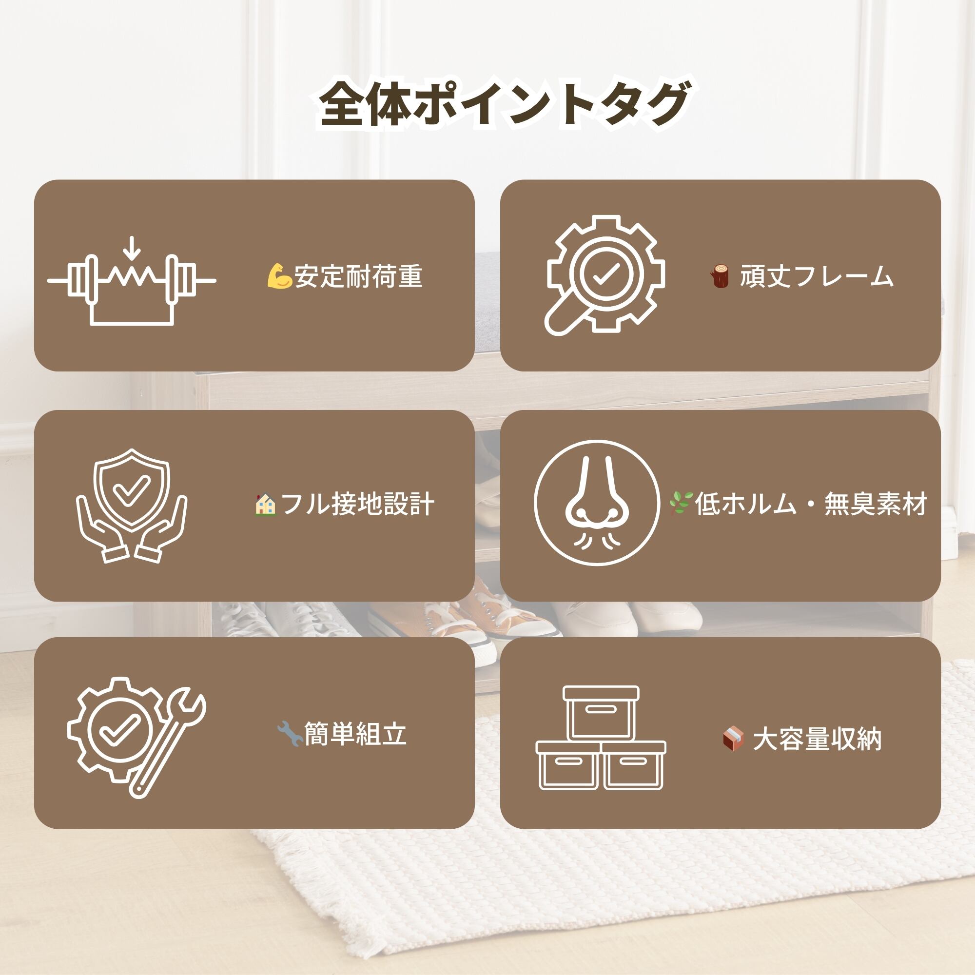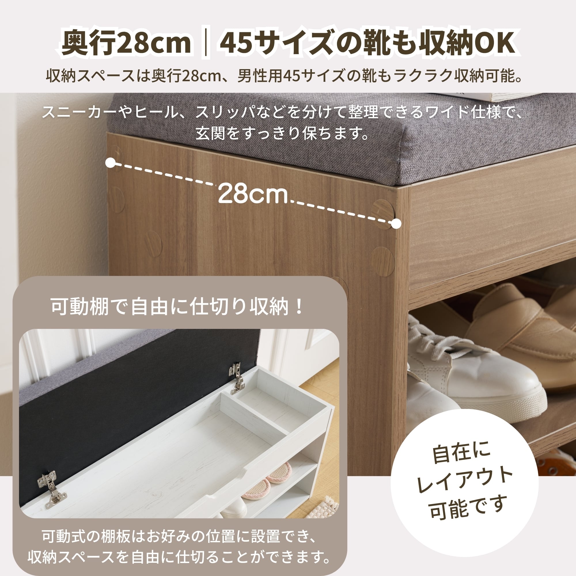 • 【美観と実用性の両立】シンプルなデザインで、ホワイト、ライトウッド、ブラウンなどいずれのカラーとグレーのクッションの組み合わせも、多様なインテリアスタイルに自然に溶け込み、玄関エリアの全体的な見栄えを向上させると同時に、日常の収納ニーズも満たします。